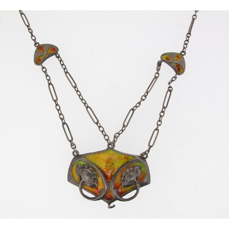 Murlle Bennett & Co, and Arts and Crafts foliate silver pendant, decorated with orange, yellow and green enamel. On fine link silver chain with two smaller sections with repeated decoration. Signed to the reverse with initials M.B.C and 950.