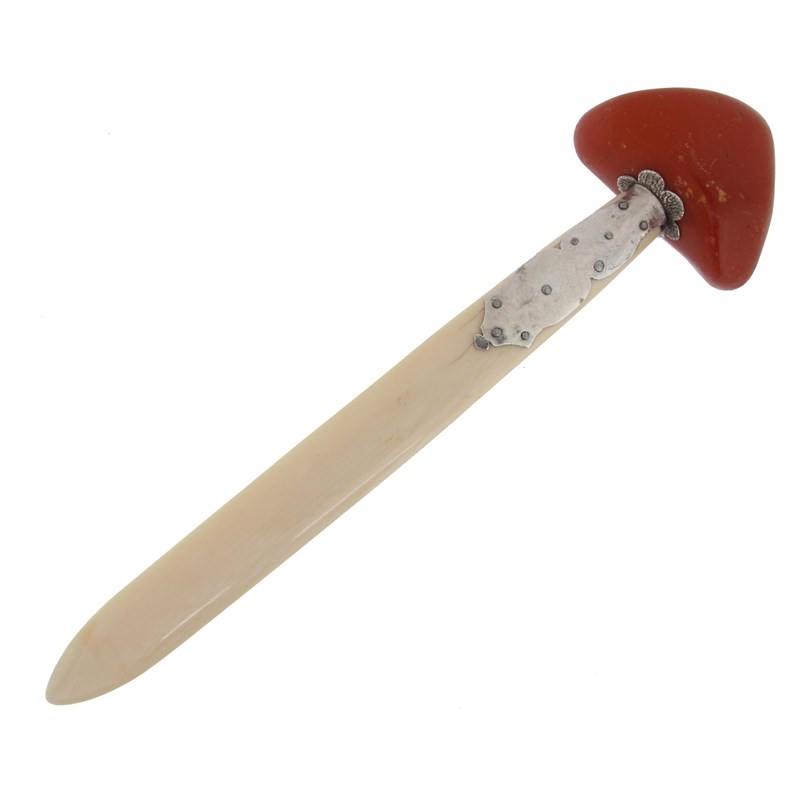 An Arts and Crafts letter opener by Murlle Bennett & Co, the ivory blade with amber terminal and the silver mount signed. 21.5cm long.