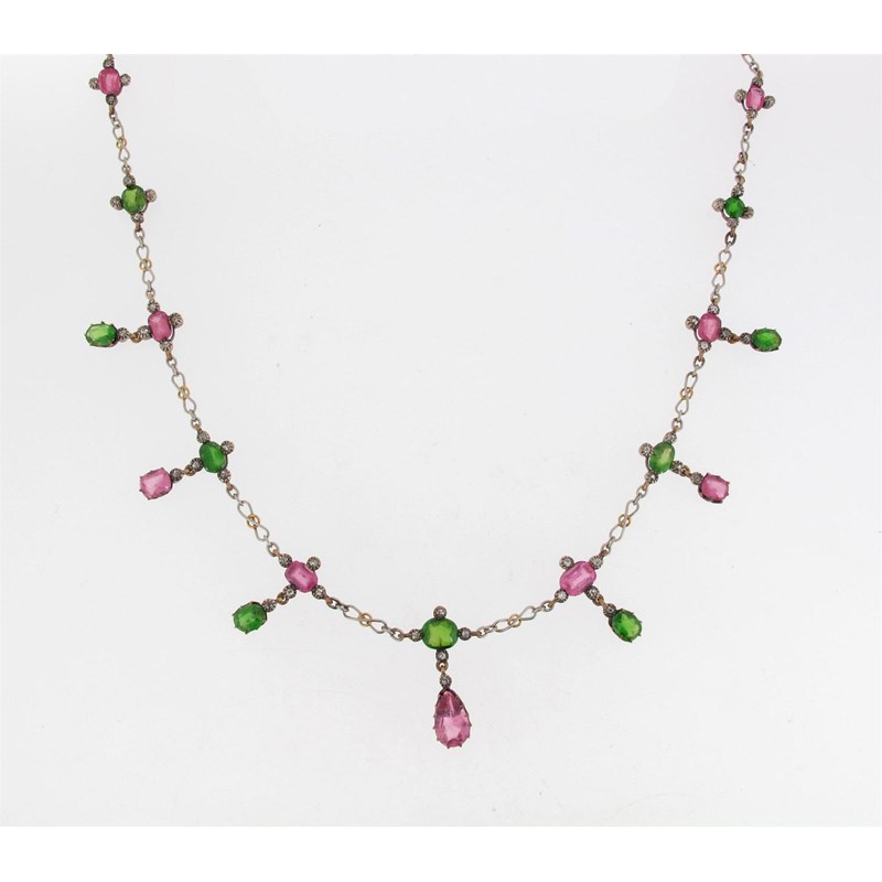 An Edwardian necklace alternately set with oval shaped pink topaz and demantoid garnets