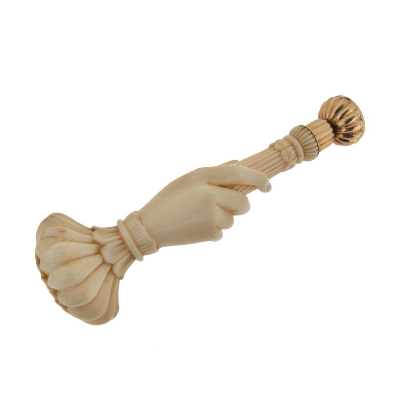A 19th Century carved ivory seal. Carved as a hand clutching a fluted seal with circular carnelean mounted to the fluted gold joint. 8cm.
