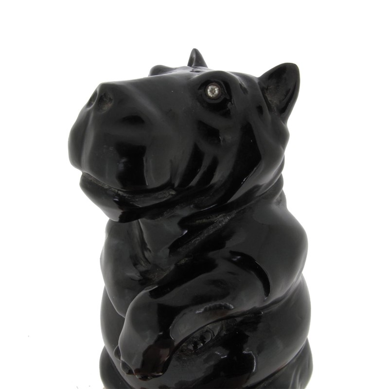 A carved hardstone figure of a seated hippopotamus, early 20th Century. Possibly obsidian with diamond set eyes, a pensive expression and crossed arms. 8cm high.