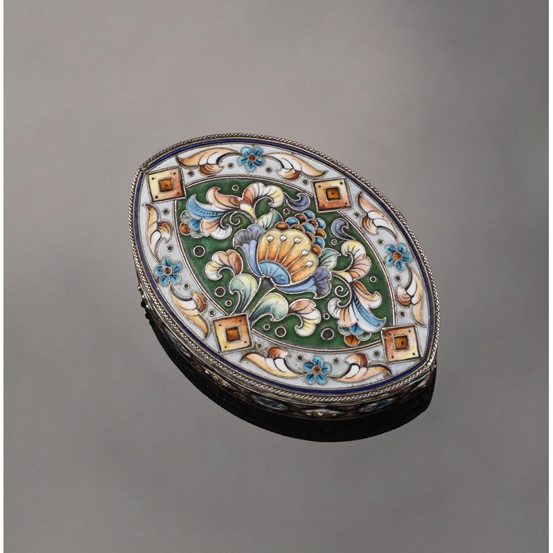 A Russian late 19th Century navette shaped silver box, decorated overall with shaded cloisonne enamel, the centre section on green ground. With purple band to the body. Gilt lined, marked for 8th Moscow Artel with 84 zolotnik mark and kokoshniks. 7cm wide.