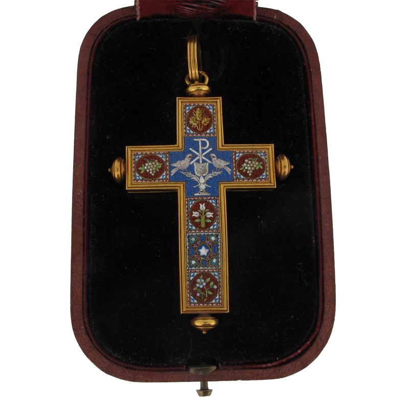 A mid 19th Century micro mosaic and gold cruciform pendant, centred with a Chi-Rho and two doves and fruiting vine and foliate plaques to the terminals. The reverse applied with fine Etruscan style wire work decoration. Unidentified mark to the suspension ring. 6.5cm high. Fitted case.