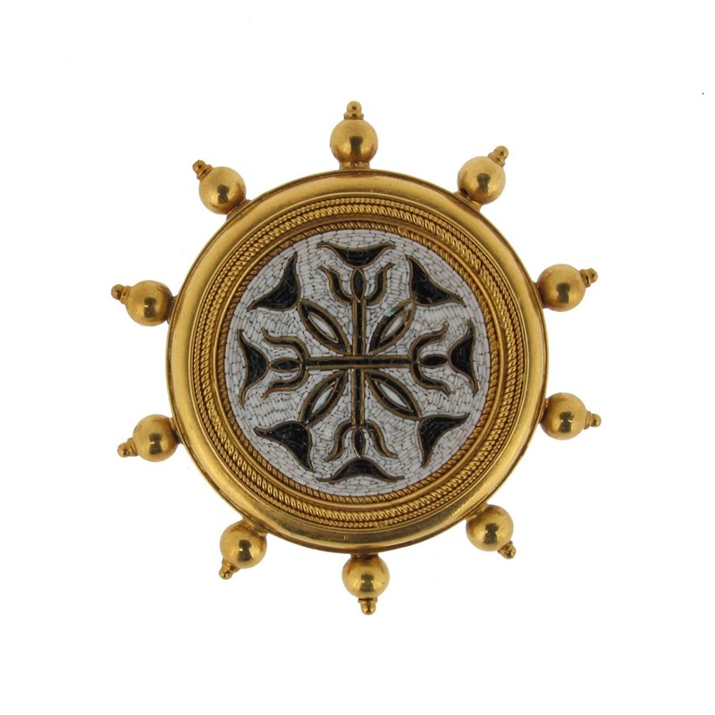 A 19th Century micro mosaic brooch, the circular plaque depicting a stylized cross in circular Etruscan style mount with unidentified marks. The micro mosaic 2cm wide.