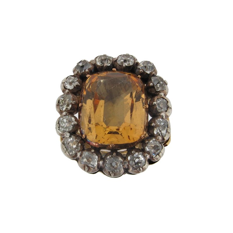 A topaz and diamond cluster ring, the cushion shaped topaz is set within a surround of fifteen cushion shaped diamonds in silver cut down colets with gold shank. Size M. Box.