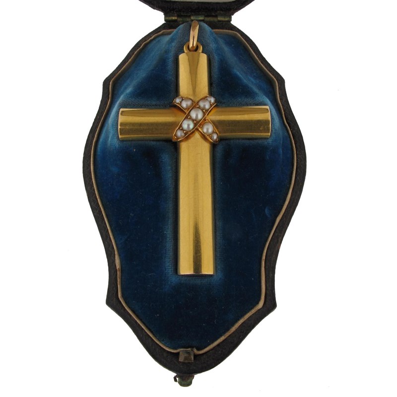 A Victorian gold cross pendant, set with graduated pearls at the joint. 5cm high. Fitted case.