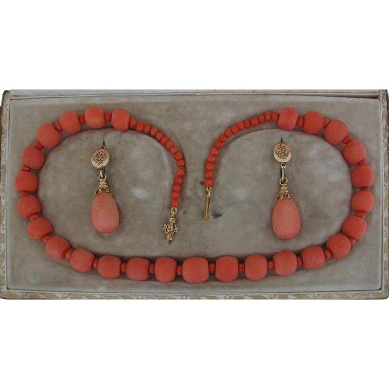 A 19th Century coral necklace, formed with engraved barrel form coral beads each separated with a smaller coral bead with gold clasp. Fitted case.