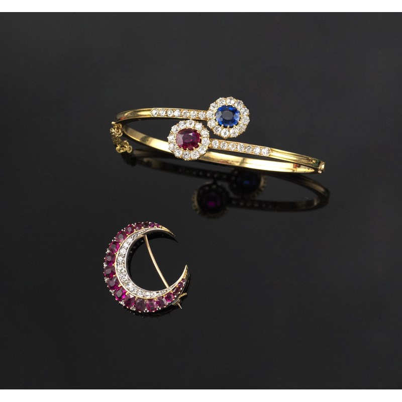 A late Victorian gold open bangle, the terminals set with diamond clusters, centred with a sapphire to one side and a ruby to the other. With a ruby and diamond set gold closed crescent brooch. Cased.