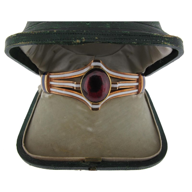 A 19th Century gold hinged bangle, centred with an oval shaped cabochon garnet. The shoulders decorated with lines of white and blue enamel. Scroll engraved to the adjustable clasp. Fitted case.