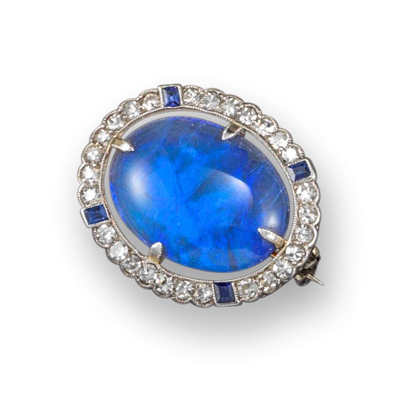 An opal and diamond brooch, the solid black opal cabochon is claw-set within a border of single-cut diamonds and four calibre-sut sapphires millegrain-set in platinum, 2.5cm wide, case
