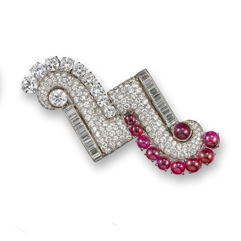 An impressive pair of Art Deco ruby and diamond clip brooches, each scroll brooch pavé-set with graduated round brilliant-cut diamonds within borders of larger graduated brilliant-cut and baguette-shaped diamonds, the counterpart set with graduated ruby cabochons, both join to form a single brooch, platinum mount, 7cm long