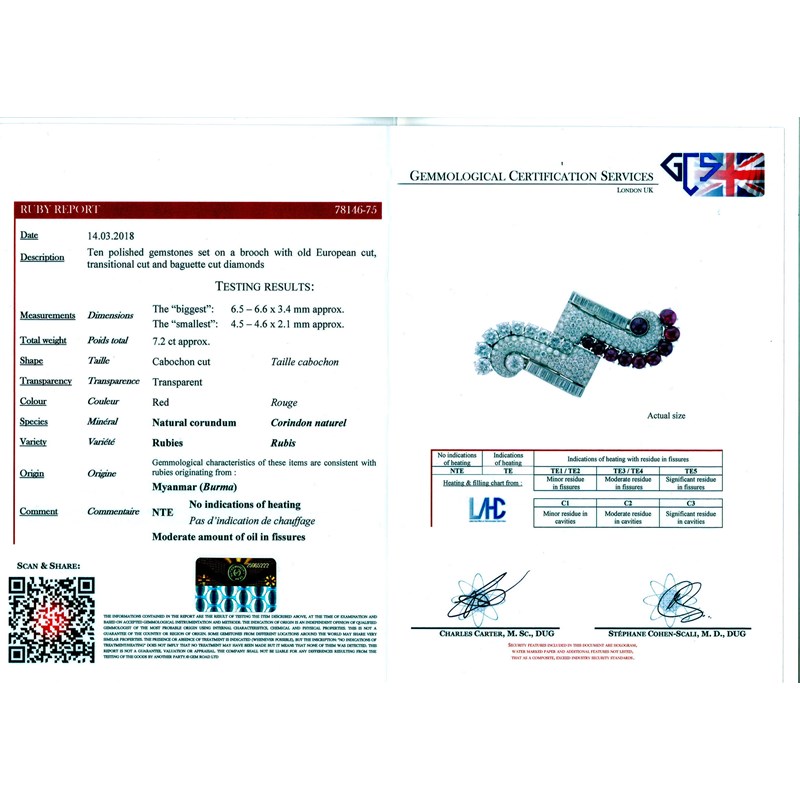 Accompanied by report number 78146-75 dated 14th March 2018 from GCS, London stating that the rubies are natural with no indications of heating, moderate amounts of oil in fissure. Origin: Burma