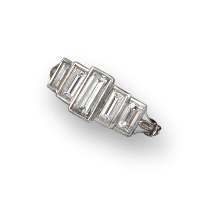 A diamond half hoop ring, set with five graduated baguette-shaped diamonds and fleur-de-lys shoulders in platinum and white gold, size N