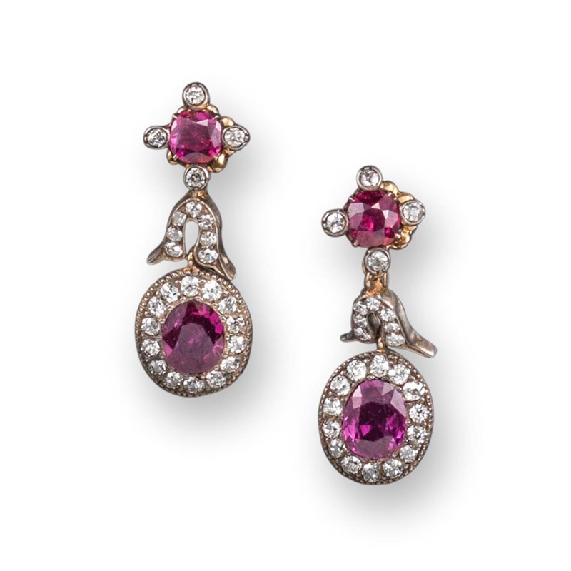 A pair of late 19th century ruby and diamond cluster earrings, the upper quatrefoil of ruby and diamonds suspending an articulating section terminating with a ruby and diamond cluster, in silver and gold, 3cm long