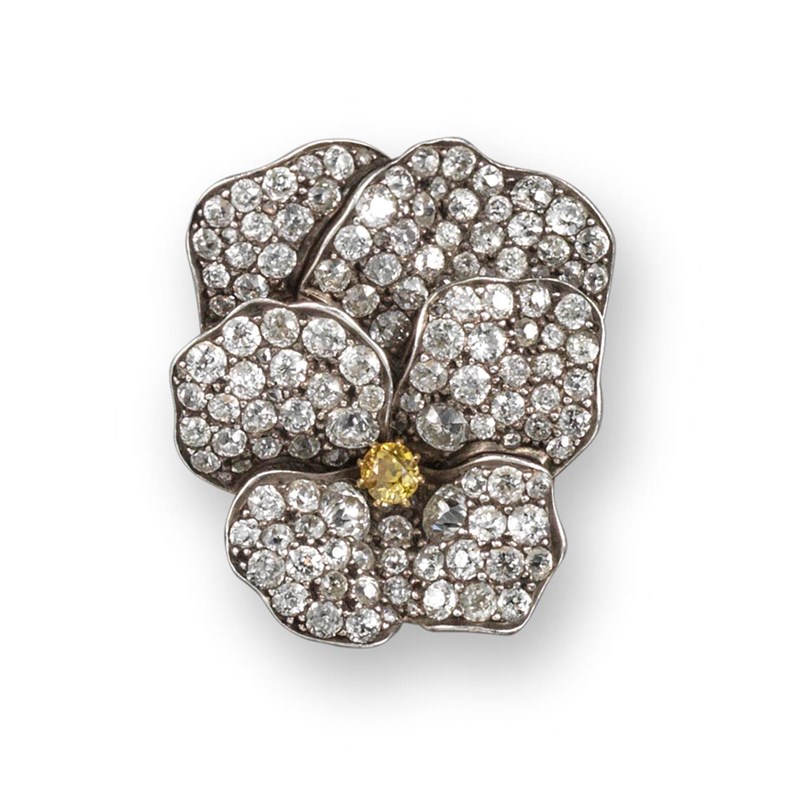 A late 19th century diamond pansy brooch pendant, the stylised flower is pave-set with diamonds and a central yellow diamond in silver and gold, with detachable brooch fitting and folding pendant loop, 4.2cm