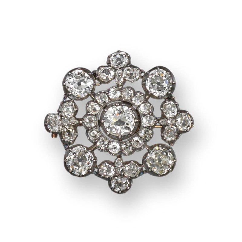 A Victorian diamond-set target brooch, set with a central cluster of old circular-cut diamonds within an outer border of diamond trefoils and single circular-cut diamonds in silver collets on gold, 2.7cm diameter