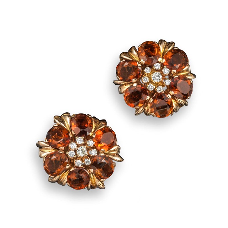 A pair of French citrine and diamond flowerhead ear clips, set with a central cluster of circular-cut diamonds within a border of matched oval-shaped citrines and fluted gold decoration, French control marks, clip fittings, 3cm diameter