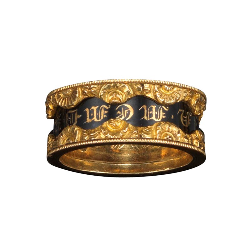 An unusual gold and enamel mourning ring, decorated to the outside with carved cornucopia pattern in an undulating design, with black enamel to the centre and the words 'IN MEMORY OF' in gold, with carved inscription to interior for 'Mary Dunnington Ob 5th Aug ae 64', with maker's mark BC & N for Barber, Cattle & North and York date letter for 1829, size M