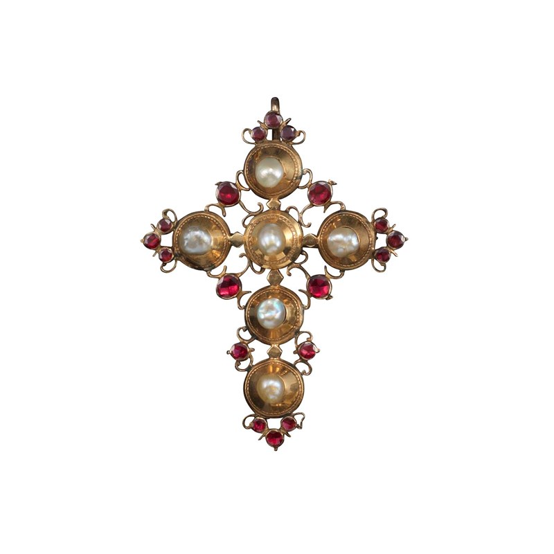 An 18th-century gold cruciform pendant brooch, each circular disc set with a pearl and further graduated circular-cut garnets, 7.5 cm high