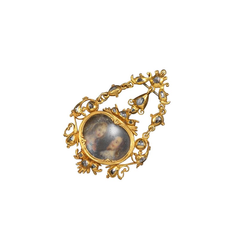 A Royal miniature portrait gold pendant depicting King Charles I and Henrietta Maria, facing each other and with arms above within scroll border, rose-cut diamonds to the open-work foliate surround and suspending from a diamond-set ornate chain, engraved with foliate scroll decoration to the reverse, later pin mount, the portrait 2cm wide