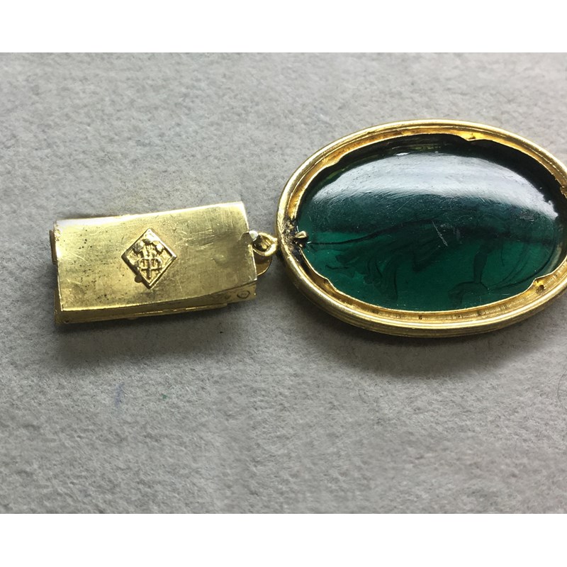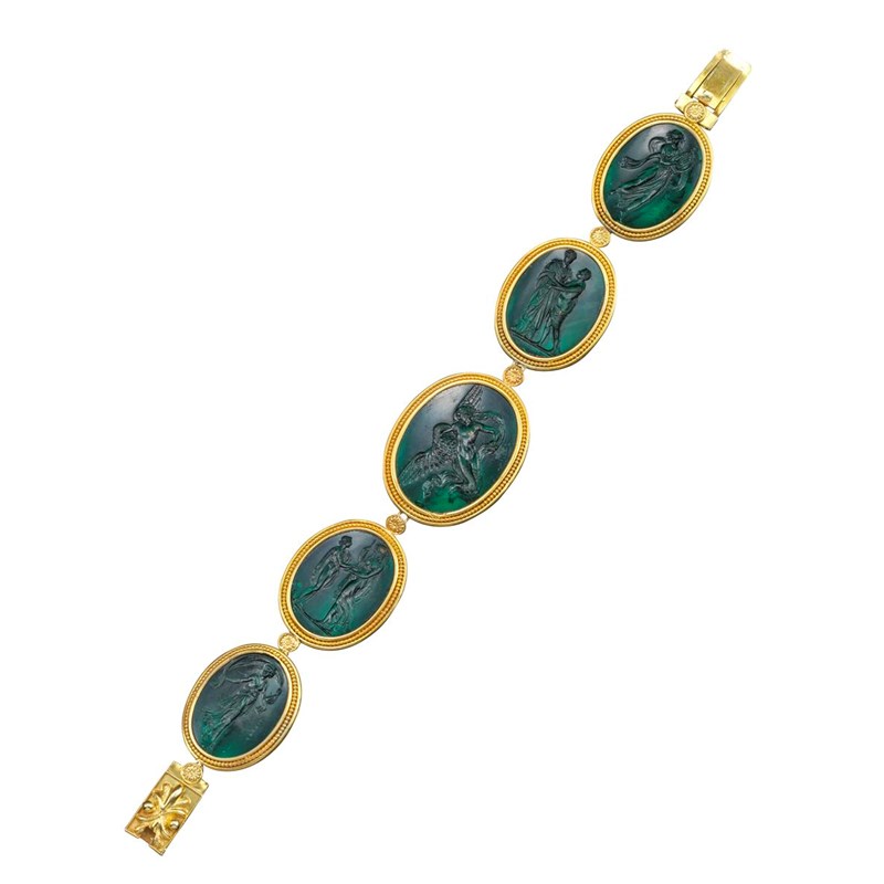 A Victorian gold and green paste intaglio bracelet by Phillips Brothers, c1870, the five graduated green paste intaglios depicting various mythological figures including Ganymede, one signed in Greek for Luigi Pilcher, each set within pellet borders with foliate clasp signed with Phillips Brothers cipher, the largest intaglio 2.6 x 2 cm, bracelet 17cm