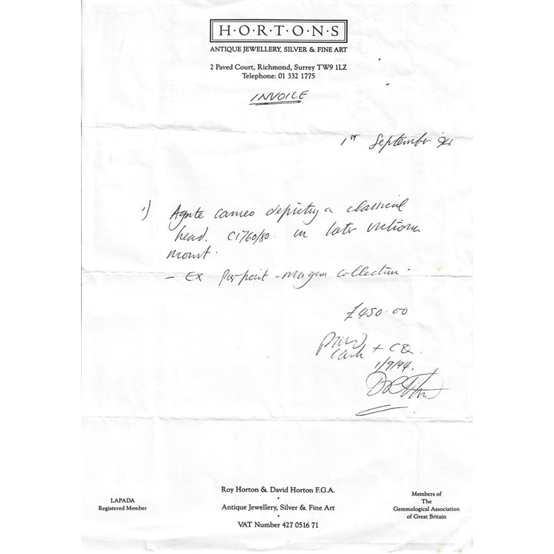Accompanied by an invoice dated 1st September 1994 from Hortons Antique Jewellery, Silver & Fine Art, Surrey stating that the cameo belonged to the Pierpont Morgan collection