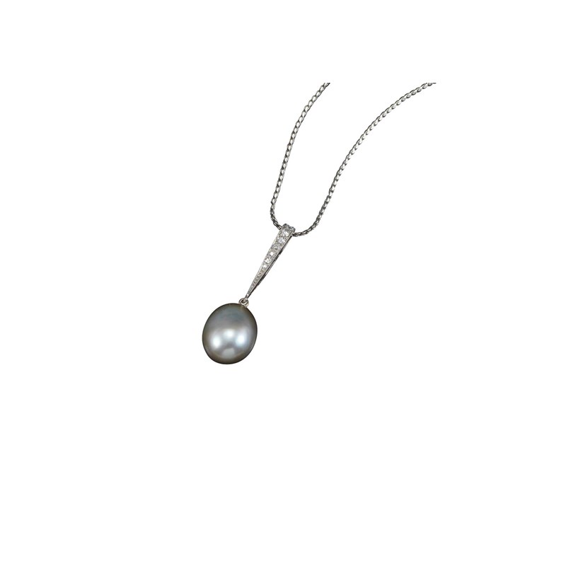 A natural pearl and diamond pendant, the light grey coloured pearl of slightly flattened form suspends from a white gold pendant millegrain-set with graduated small circular-cut diamonds, on a fine-link white gold neck chain, pendant 3cm high, chain 45cm