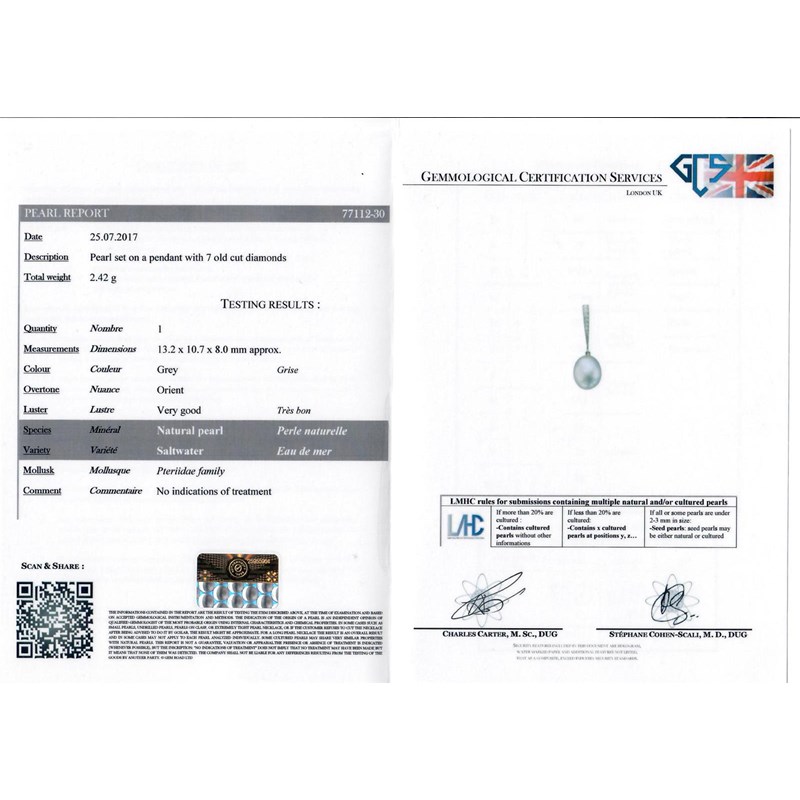 Accompanied by report number 77112-30 dated 25th July 2017 from GCS, London stating that the grey pearl measures 13.2 x 10.7 x 8.0 mm and is a natural saltwater pearl with no indications of treatment