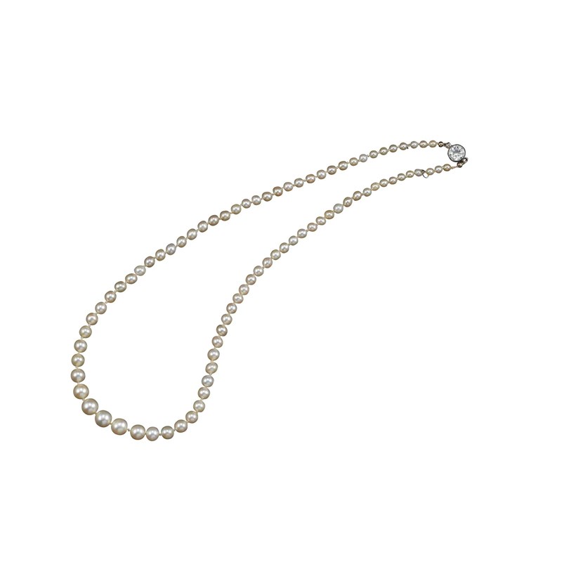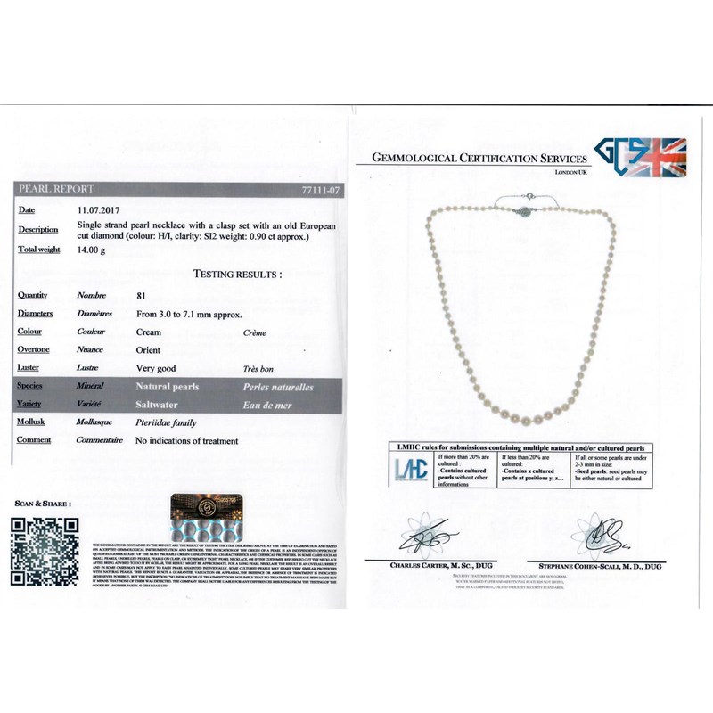 A single-row pearl necklace, the pearls graduate from 3.17-7.09mm, the clasp millegrain-set with an old circular-cut diamond in platinum, diamond weighs approximately 0.85cts, necklace 44cm long