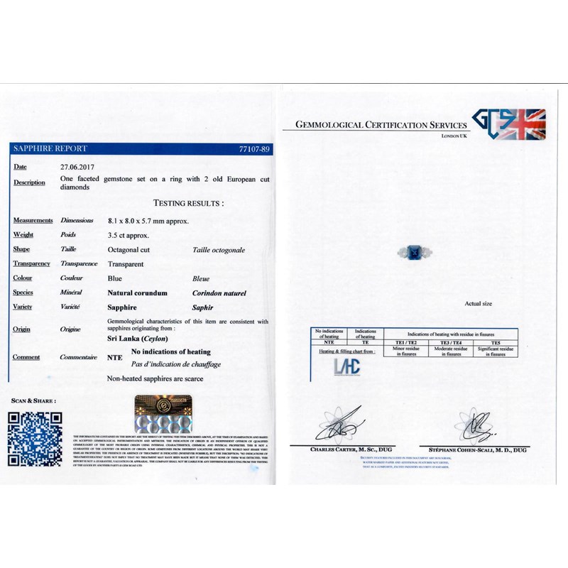 Accompanied by report number 77107-89 dated 27 June 2017 from GCS, London stating that the octagonal-cut sapphire weighs approximately 3.5cts and is a natural sapphire with no indications of heat treatment, origin: Sri Lanka (Ceylon)