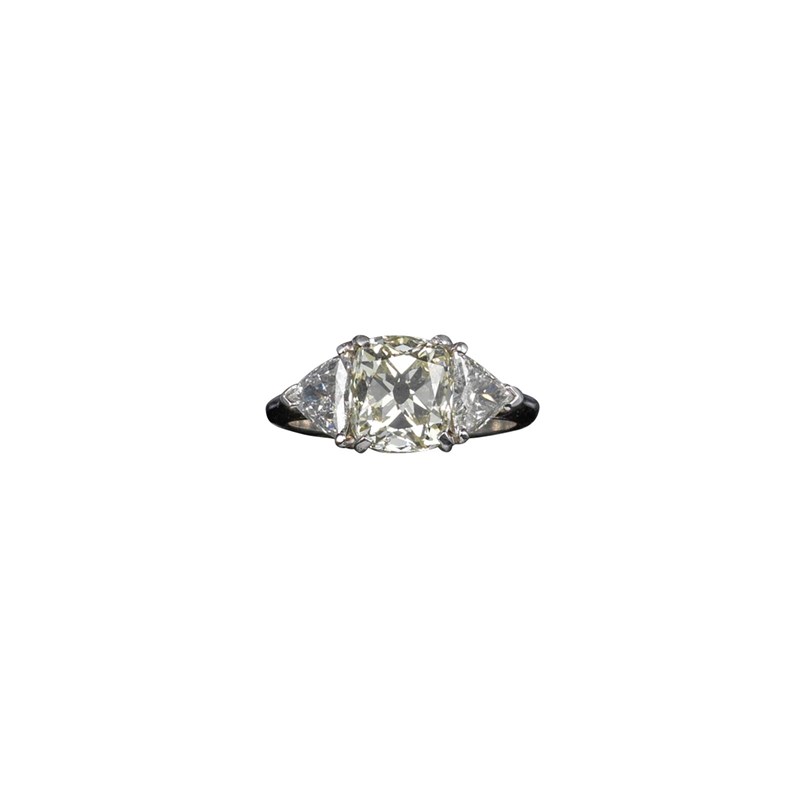 A diamond three-stone ring, the old cushion-shaped centre diamond weighs 2.56cts and is set within trillion-shaped shoulder diamonds in platinum, size L ½