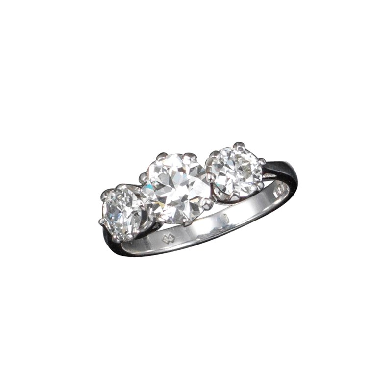 A diamond three-stone ring, the transitional-cut diamonds set in platinum, centre diamond weighs approximately 1.30cts, total diamond carat weight approximately 2.25cts, size P