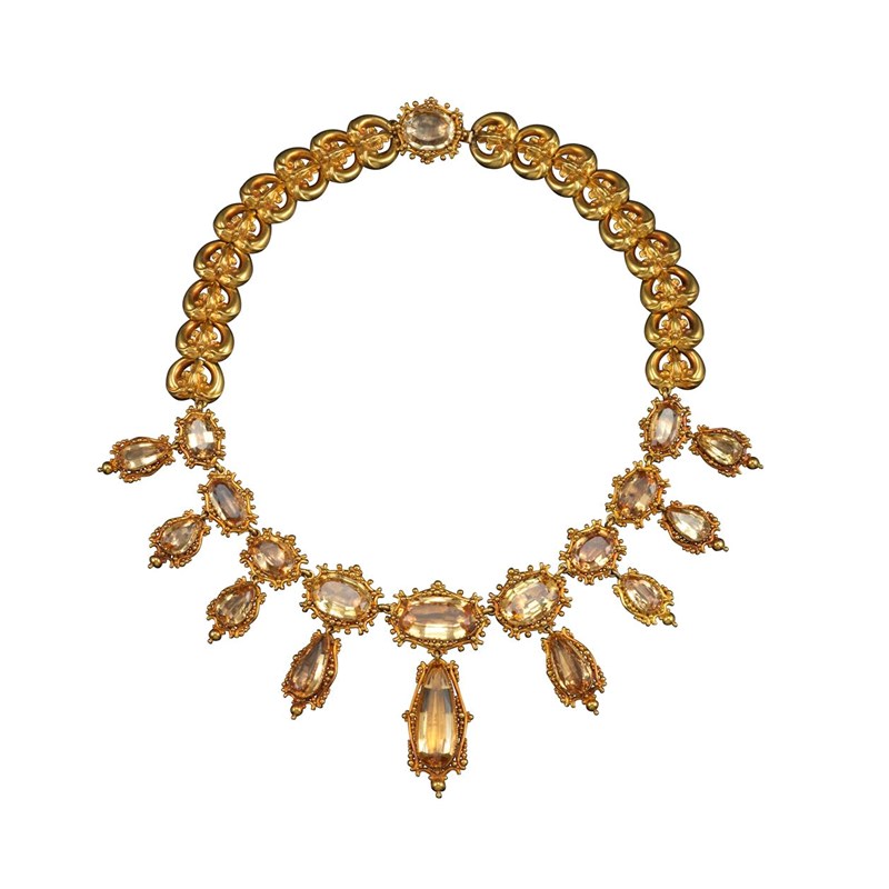 An early 19th-century topaz necklace, comprising nine graduated oval-shaped topaz each suspending a pear-shaped topaz in closed-back gold collets with bead decoration, the back chain formed as gold open-work foliate links with a topaz-set conforming gold clasp, the topaz weigh 100.00cts total