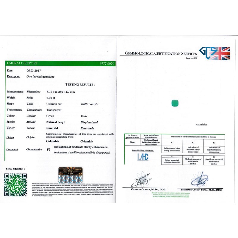 Accompanied by report number 5777-9070 dated 6th March 2017 from GCS, London stating that the cushion-cut emerald weighs approximately 2.03cts and is a natural emerald with indications of moderate clarity enhancement, origin: Colombia