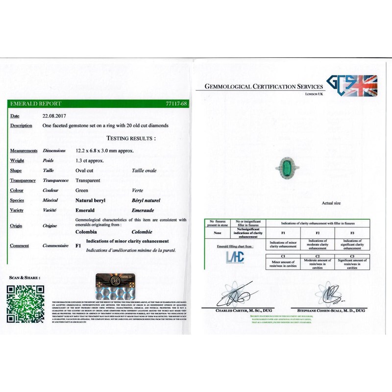Accompanied by report number 77117-68 dated 22nd August 2017 from GCS London stating that the oval-shaped emerald weighs approximately 1.30cts and is Colombian with minor clarity enhancement.