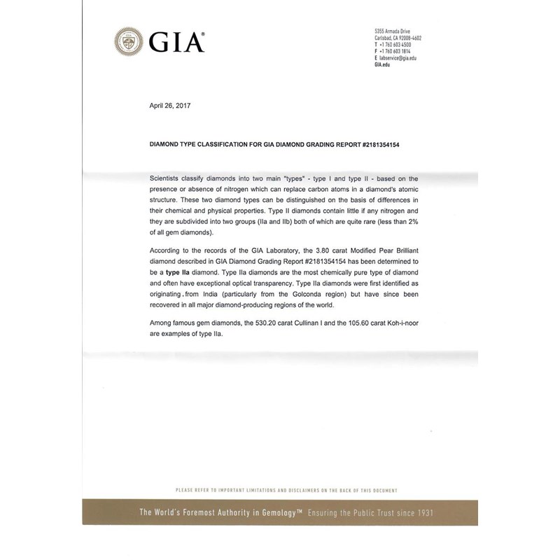 Accompanied by an additional letter dated 26 April 2017 from GIA, New York stating that the pear-shaped diamond is type IIa
