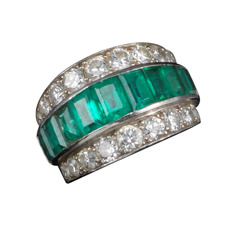 An Art Deco emerald and diamond cocktail ring, set with a central line of emerald-cut emeralds within borders of circular-cut diamonds in platinum, size M