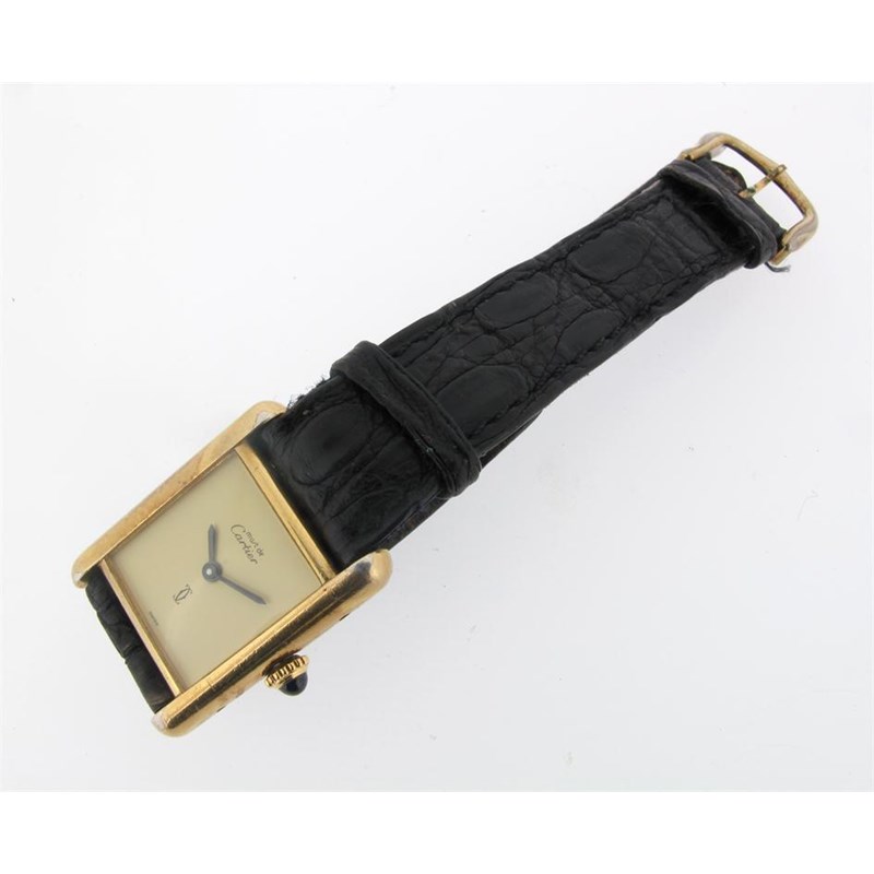 A le Must de Cartier Tank. Quartz movement. Silver gilt case. Cream dial. Case number 3 155884. Case measures 23mm x 30mm.
