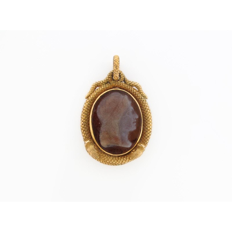 A fob seal with foliate and fruit decoration to the stem and mounted with a carnelean carved with full arms. 3.3cm high. And a fob seal with open oval decoration to the stem and mounted with a carnelean engraved with full arms. 3.3cm high. A smaller fob seal mounted with a chalcedony engraved with initials. And a fob seal with tasse seal.