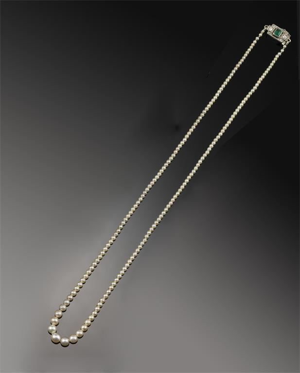 A single row graduated pearl necklace, the pearls graduate from 1.8 to 5.6mm. With an emerald and diamond set white gold clasp.