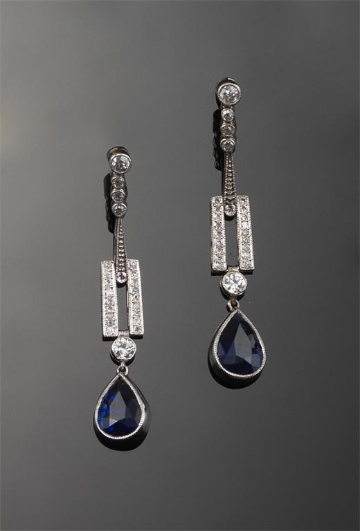 A pair of sapphire and diamond drop earrings, the pear shaped sapphires suspend from diamond set articulated sections. 4cm long.