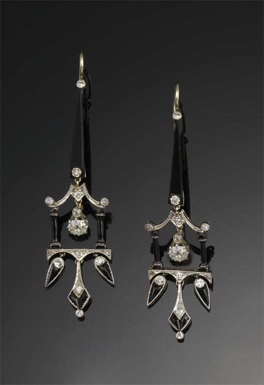 A pair of Art Deco Chinoiserie style drop earrings, the stylised pagodas decorated with black enamel and set with small diamonds and suspend from a line of black onyx. 6cm high. Fitted box.