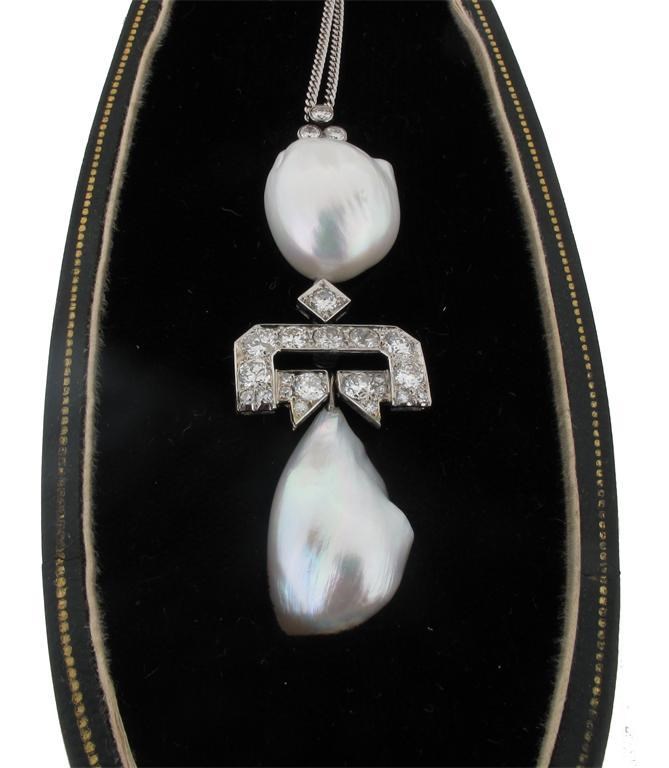 A pearl and diamond pendant, mounted with two baroque shaped pearls and set with diamonds in white gold. On a fine link white gold neck chain.