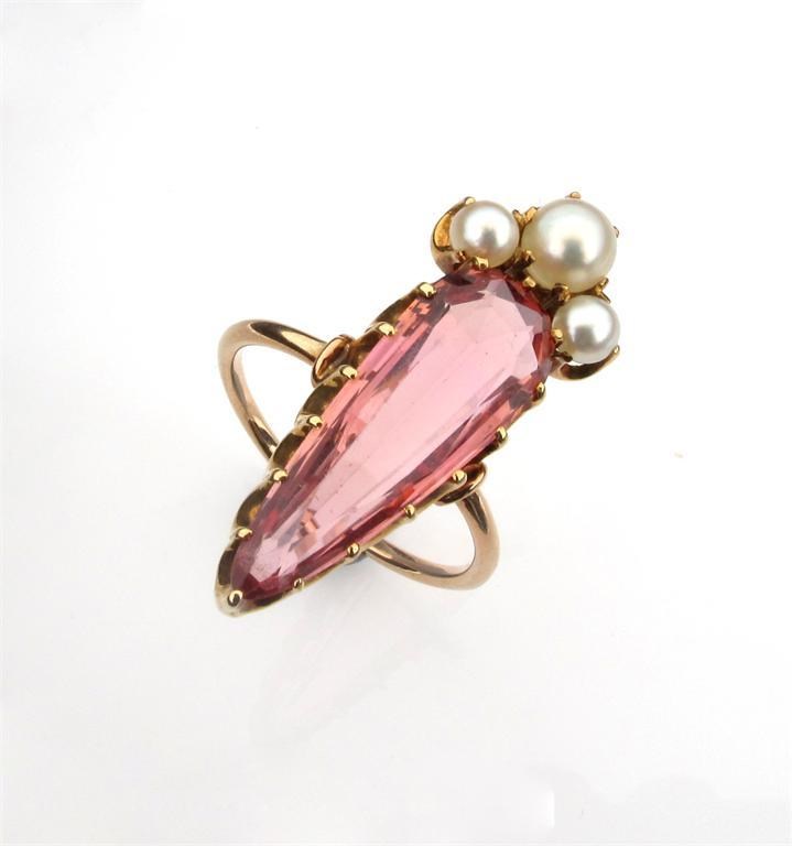 A topaz and cultured pearl ring, set in gold. The long pear shaped topaz weighs approximately 3.70cts.
