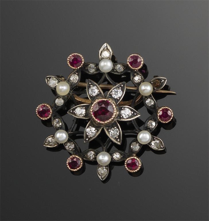 A late Victorian ruby diamond and seed pearl brooch pendant, set in silver and gold with detachable pendant and brooch fitting. Fitted case.