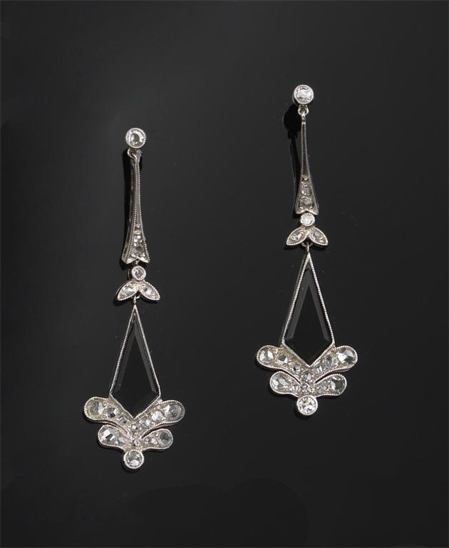 A pair of Art Deco drop earrings, set with kite shaped sections of black onyx and small diamonds in white gold. Fitted case.
