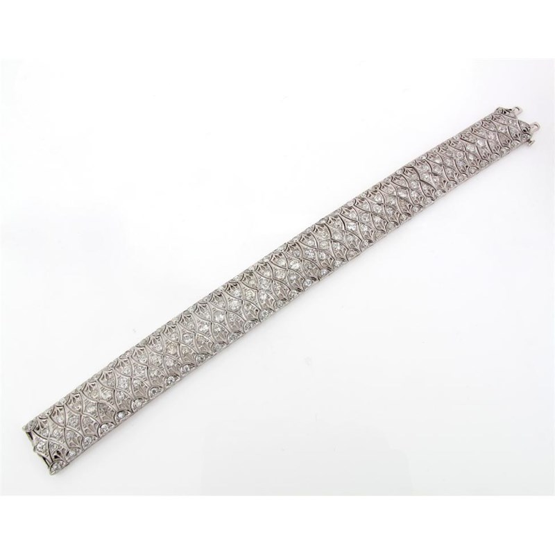 A diamond bracelet, millegrain set overall with graduated circular cut diamonds to the multi hinged open work foliate links. Set in white gold. 18.5cm long.
