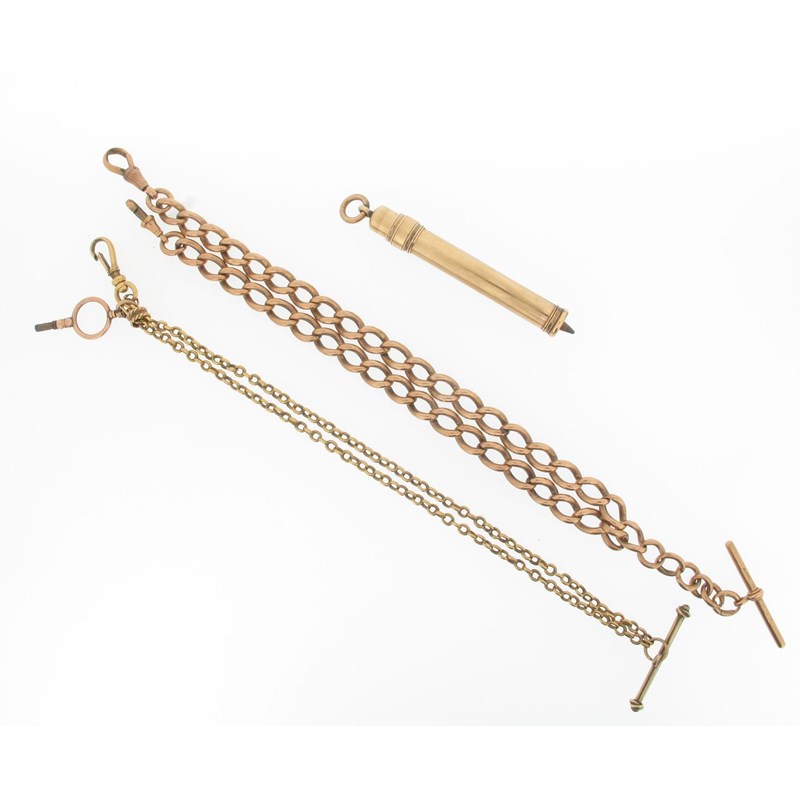 A gold propelling pencil by S. Mordan & Co, a 9ct gold twisted curb-link watch chain with swivel clips and T-bar, and an oval-link watch chain with swivel clip, T-bar and watch key. 87.0g in total.