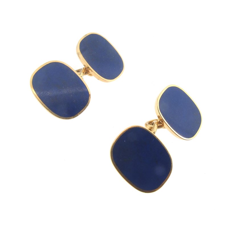 A pair of lapis lazuli mounted gold cufflinks, the cushion-shaped plaques are set with lapis lazuli in yellow gold rub-over mounts, conjoined by oval-link chains. With makers mark A.W and Sheffield import marks for 1992. In Patek Philippe case.