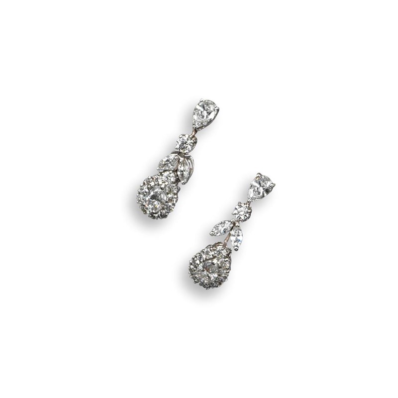 A pair of diamond drop earrings, the pear shaped diamonds are set within a surround of eleven round brilliant cut diamonds, a pair of marquise shaped diamonds, a round brilliant cut diamond and an inverted pear shaped diamond in white gold. 2.5cm high.